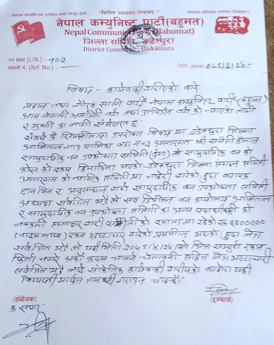 कृते कागज गरी समुदायिक वन उपभोक्ता समिति र सव डिभिजन वन कार्यालय आलिताललाई छलेर सामुदायिक वनको खातामा रहेको २२ लाख रुपैयाँ सामुदायिक वन उपभोक्ता समितिका अध्यक्ष मडैले भ्रष्टाचार गरेको आरोपमा सांकेतिक कारबाही गरिएको सो पार्टीले जनाएको छ।