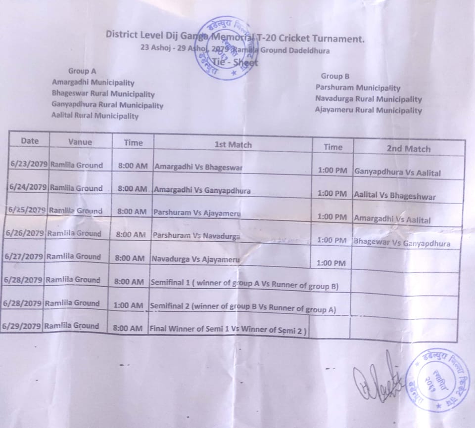डडेल्धुरा जिल्ला क्रिकेट संघको आयोजनामा हुने प्रतियोपगिता असोज २९ गतेसम्म संचालन हुनेछ । जिल्ला सातवटै स्थानीय तहका टिमलाई दुई समूहमा विभाजन गरिएको छ । समूह ‘ए’ मा अमरगढी नगरपालिका, भागेश्वर गाउँपालिका, गन्यापधुरा गाउँपालिका र आलिताल गाउँपालिका छन् । समूह ‘बी’ मा परशुराम नगरपालिका, नवदुर्गा गाउँपालिका र अजयमेरु गाउँपालिका रहेका छन् ।