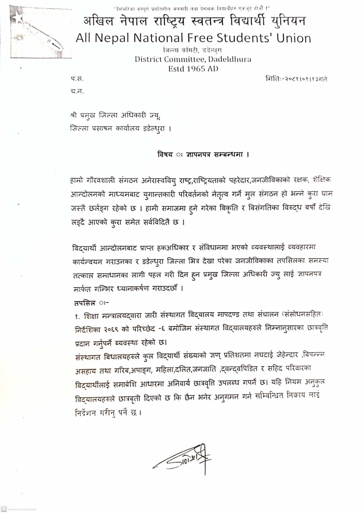 बिहीबार अनेरास्ववियु डडेल्धुराका इन्चार्ज एवं केन्द्रीय सदस्य पुष्कर देउवाको नेतृत्वमा प्रशासान पुगेको विद्यार्थी टोलीले डडेल्धुराका प्रमुख जिल्ला अधिकारी चोमेन्द्र न्यौपानेलाई ज्ञापनपत्र बुझाएको हो। अनेरास्ववियु डडेल्धुराले संस्थागत विद्यालयमा अध्ययन गर्ने विद्यार्थीलाई अनिवार्यरूपमा छात्रवृत्ति उपलब्ध गराउन माग गरेको छ।