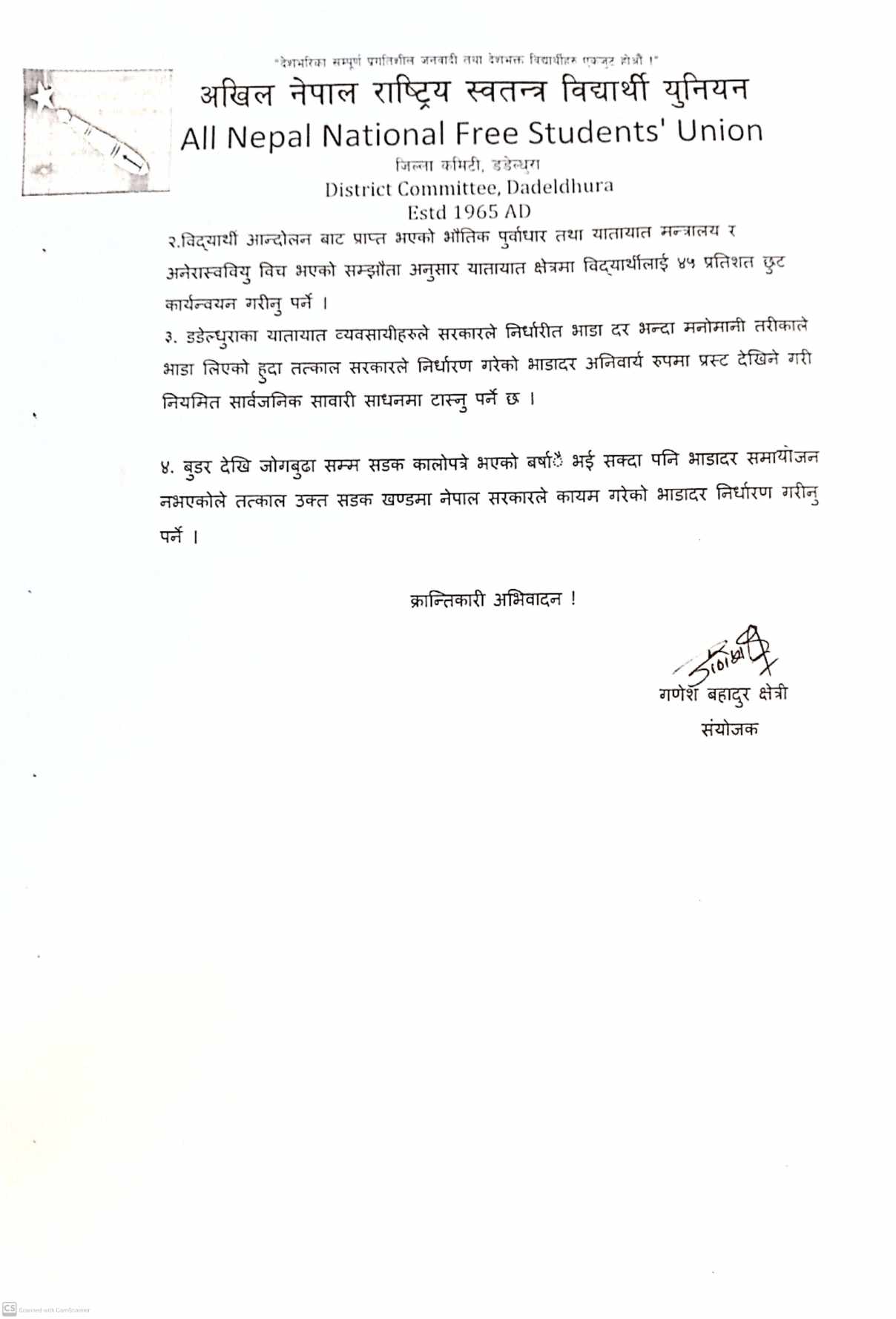 यसका साथै डडेल्धुराका यातायात व्यवसायीहरूले मनोमानी तरिकाले भाडा लिएको हुँदा तत्काल सरकारले निर्धारण गरेको भाडादर अनिवार्यरूपमा प्रस्ट देखिने गरी नियमित सार्वजनिक सावारी साधनमा टाँस्नुपर्ने अनेरास्ववियुको माग छ।