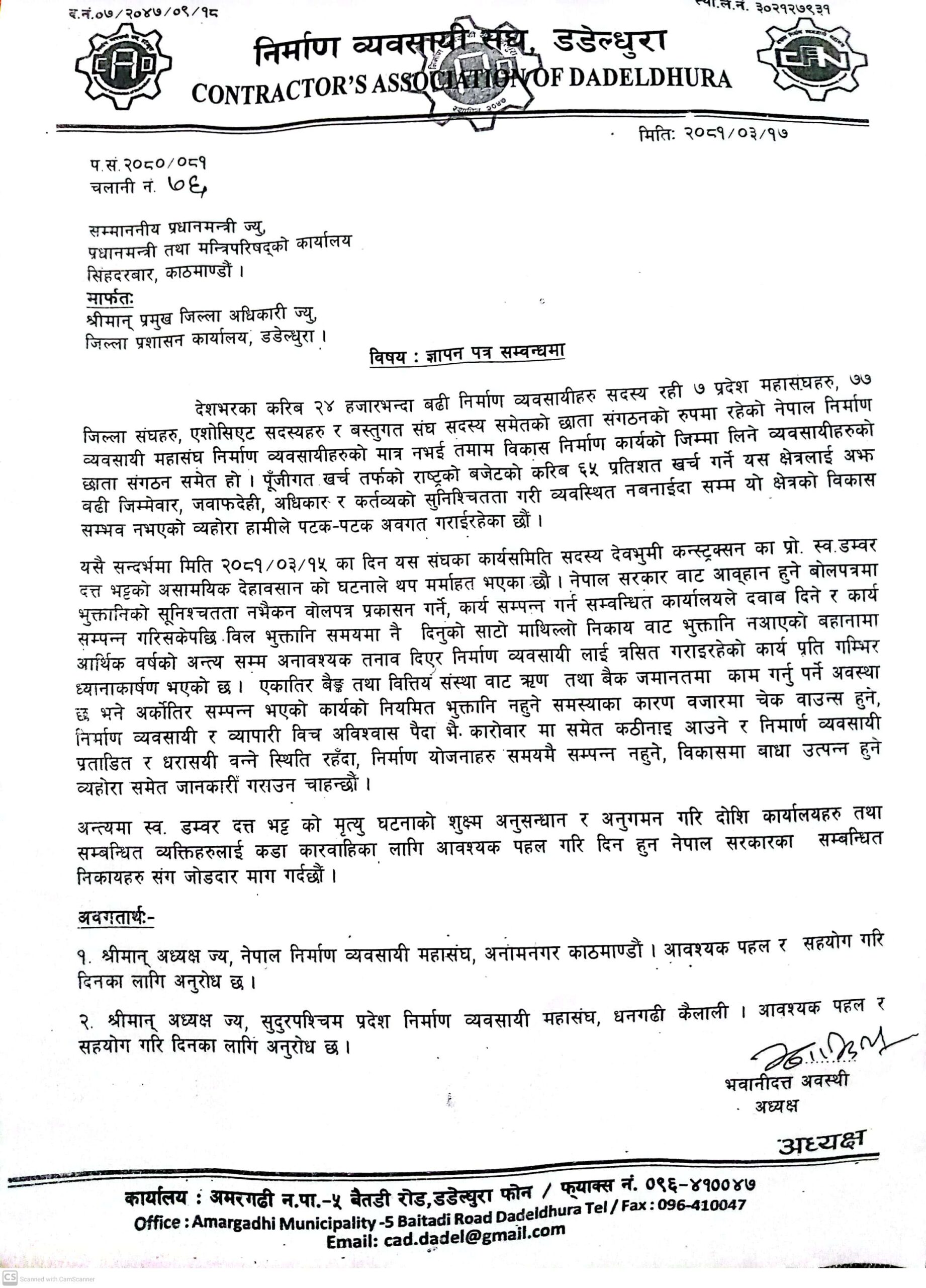 निर्माण व्यवसायी संघले प्रशासनमार्फत् उक्त ज्ञापनपत्र प्रधानमन्त्री तथा मन्त्रिपरिषद्को कार्यालय सिंहदरबार, काठमाडौंलाई समेत पठएको छ। यहीँ असार १५ का दिन संघका कार्यसमिति सदस्य एवं देवभूमि कन्स्ट्रक्सनका सञ्चालक भट्ट घाँटी रेटिएको अवस्थामा जंगलमा घाइते फेला परेका थिए। अमरगढी नगरपालिका–५ का ४५ वर्षीय भट्टको शनिबार दिउँसो धनगढीमा मृत्यु भएको थियो।