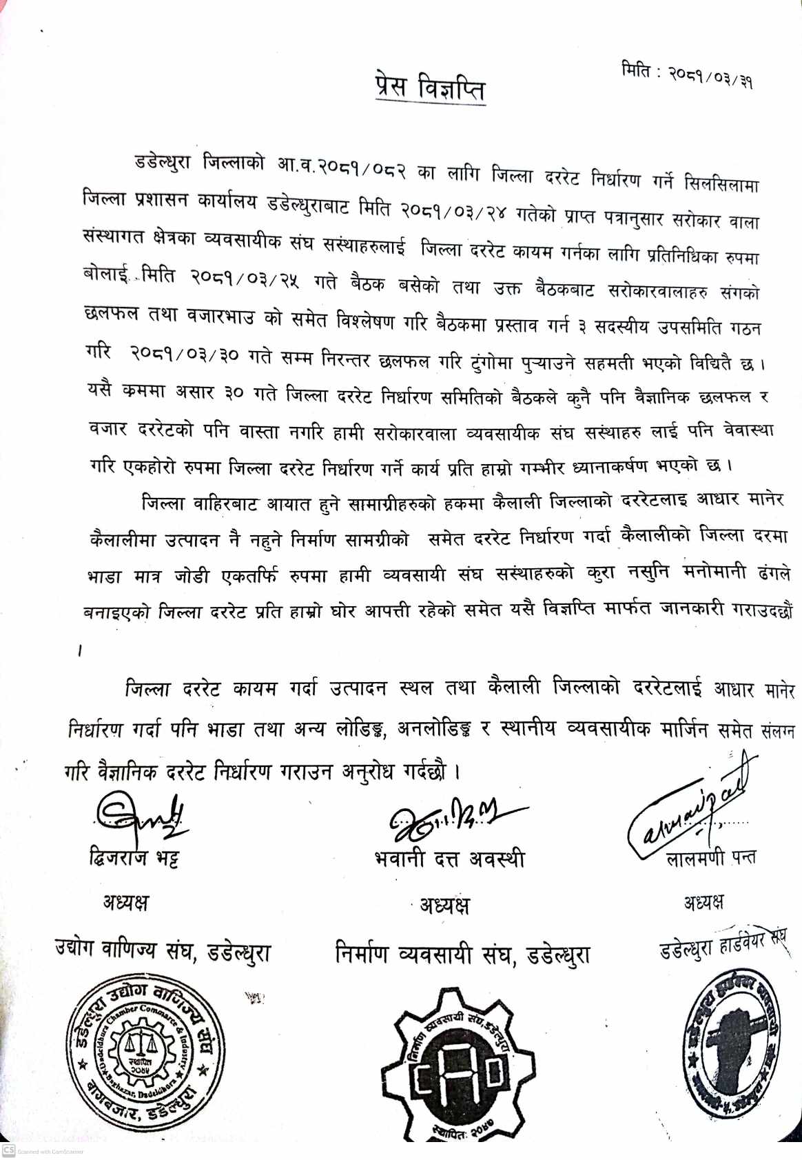 डडेल्धुरा उद्योग वाणिज्य संघका अध्यक्ष द्विजराज भट्ट, निर्माण व्यवसायी संघका अध्यक्ष भवानीदत्त अवस्थी र डडेल्धुरा हार्डवेयर संघका अध्यक्ष लालमणी पन्तले संयुक्त प्रेस विज्ञप्तिमार्फत् व्यवसायिक संघसंस्थाहरूलाई बेवास्था गरी एकहोरो रूपमा जिल्ला दररेट निर्धारण गर्ने कार्यप्रति गम्भीर ध्यानाकर्षण भएको जनाएका छन् ।