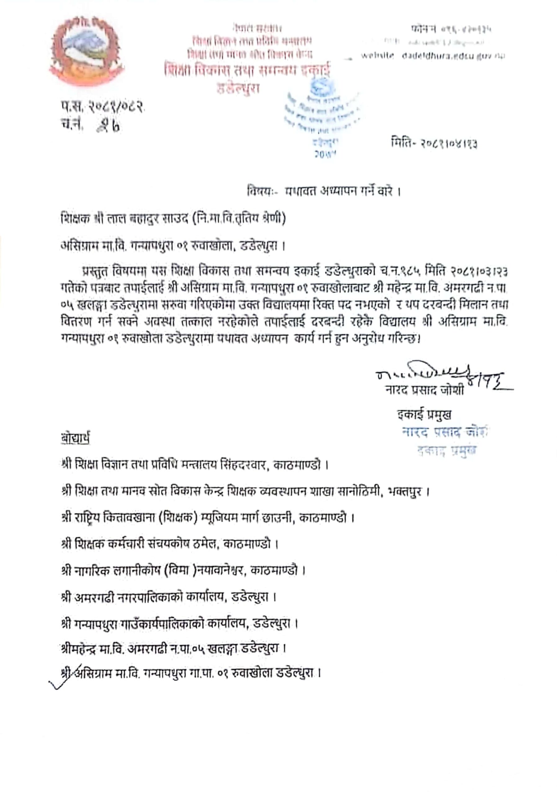शिक्षा विकास तथा समन्वय इकाई प्रमुख नारदप्रसाद जोशीद्वारा हस्ताक्षरित पत्रमा भनिएको छ, ‘…असिग्राम मावि गन्यापधुरा १ रुवाखोलाबाट महेन्द्र मावि अमरगढी ५ खलङ्गा डडेल्धुरामा सरुवा गरिएकोमा उक्त विद्यालयमा रिक्त पद नभएको र थप दरबन्दी मिलान तथा वितरण गर्न सक्ने अवस्था तत्काल नरहेकोले तपाईंलाई दरबन्दी रहेकै विद्यालय असिग्राम मावि गन्यापधुरा १ रुवाखोला डडेल्धुरामा यथावत् अध्यापन कार्य गर्न हुन अनुरोध गरिन्छ।’