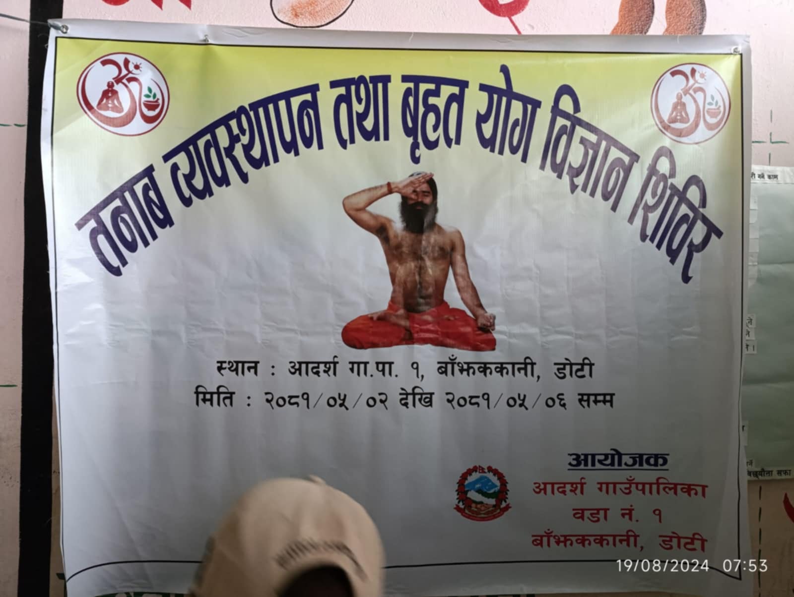 डोटी: डोटीको आदर्श गाउँपालिका–१ बाँझककानीमा पाँचदिने तनाव व्यवस्थापन तथा वृहत् योग विज्ञान शिविर सम्पन्न भएको छ। वडा कार्यालयको आयोजनामा भदौ २ गतेदेखि सुरु भएको उक्त शिविर बिहीबार सम्पन्न भएको हो।