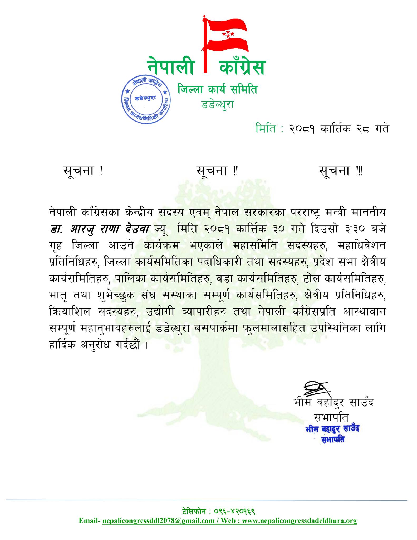 डडेल्धुरा आउँदै परराष्ट्रमन्त्री राणा, फूलमालासहित स्वागत गर्न कांग्रेसको सर्कुलर