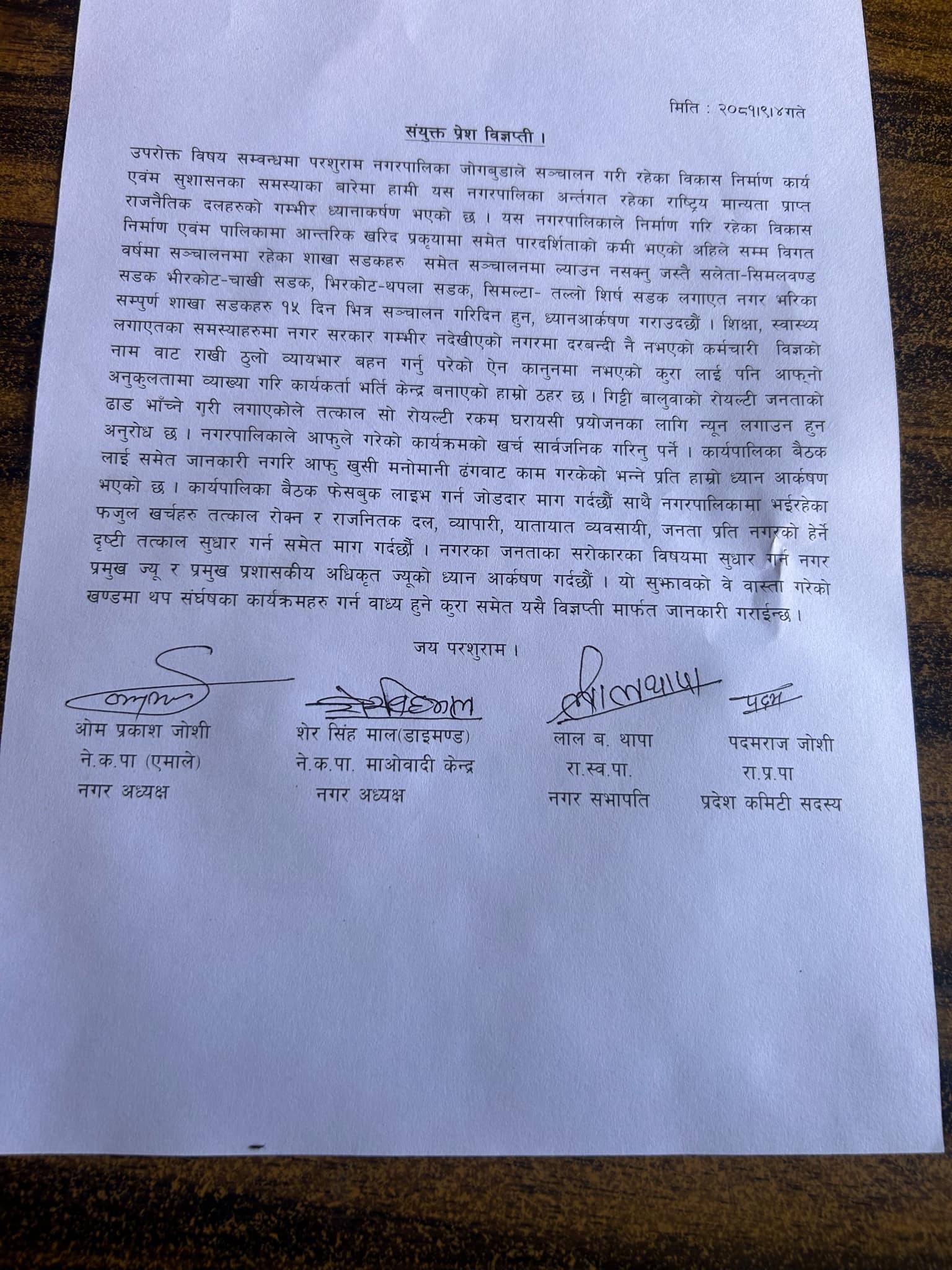 नेकपा (एमाले) का नगर अध्यक्ष ओमप्रकाश जोशी, नेकपा (माओवादी केन्द्र) का नगर अध्यक्ष शेरसिंह माल (डाइमण्ड), रास्वपाका नगर सभापति लालबहादुर थापा र राप्रपाका प्रदेश कमिटी सदस्य पदमराज जोशीले जारी गरेको विज्ञप्तिमा नगरपालिकाले निर्माण गरिरहेका विकास निर्माण एवं पालिकामा आन्तरिक खरिद प्रकृयामा समेत पारदर्शिताको कमी भएको उल्लेख छ।