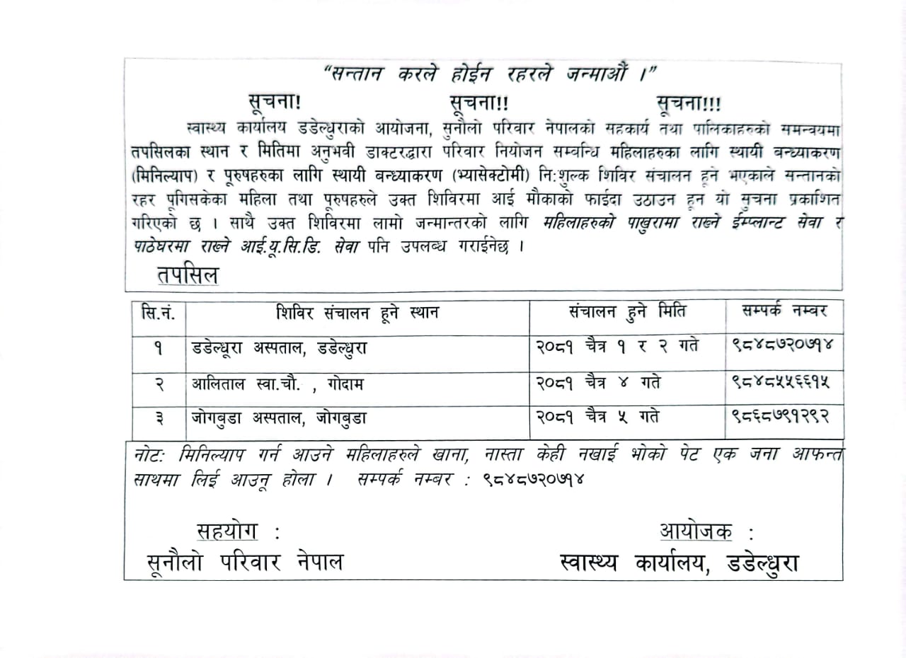 स्वास्थ्य कार्यालयका परिवार नियोजन अधिकृत भवानसिंह कुँवरका अनुसार शिविर चैत १ र २ गते डडेल्धुरा अस्पताल, चैत ४ गते आलिताल स्वास्थ्य चौकी गोदाम र चैत ५ गते जोगबुडा अस्पतालमा सञ्चालन हुनेछ। उनले सन्तानको रहर पुगिसकेका महिला तथा पुरुषहरूले उक्त शिविरमा आएर सेवा लिन अनुरोधसमेत गरेको गरे।