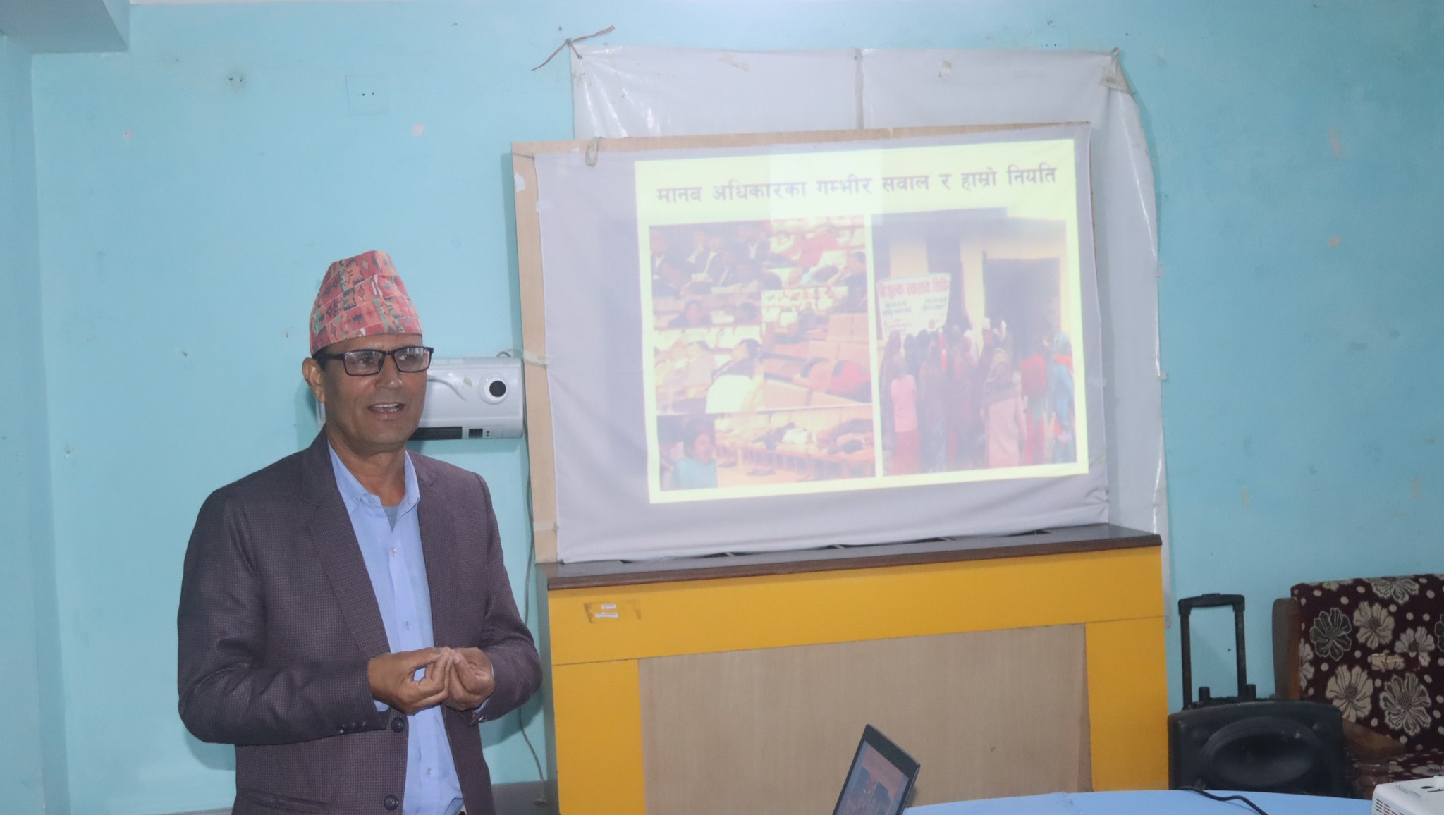 कार्यक्रममा अधिवक्ता विष्णु भट्टले मानवअधिकार र रक्षकहरूको पहिचान, भूमिका र चुनौतीका बारेमा प्रकाश पारेका थिए। मानवअधिकारसम्बन्धी सचेतना फैलाउनु आवश्यक रहेको पनि उनको तर्क थियो।