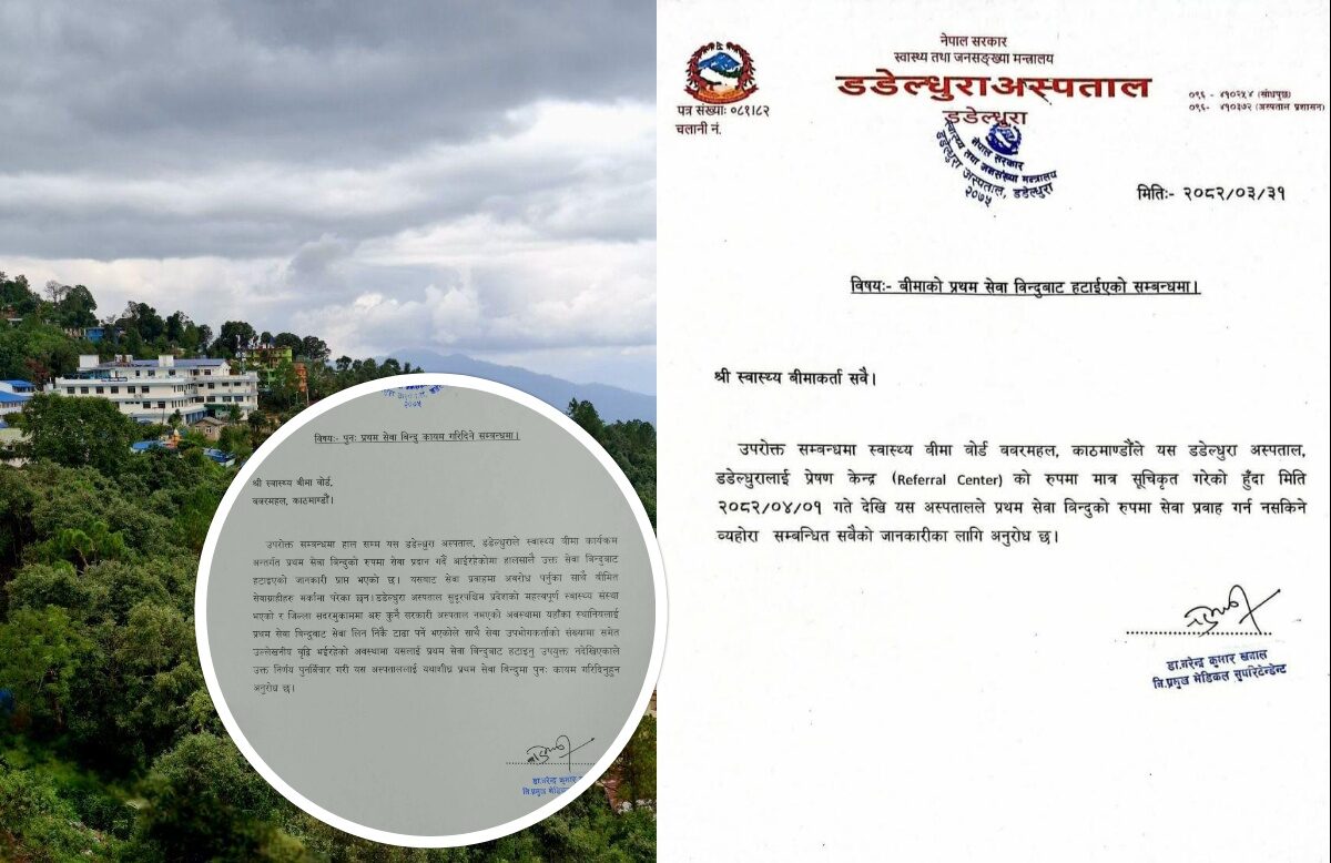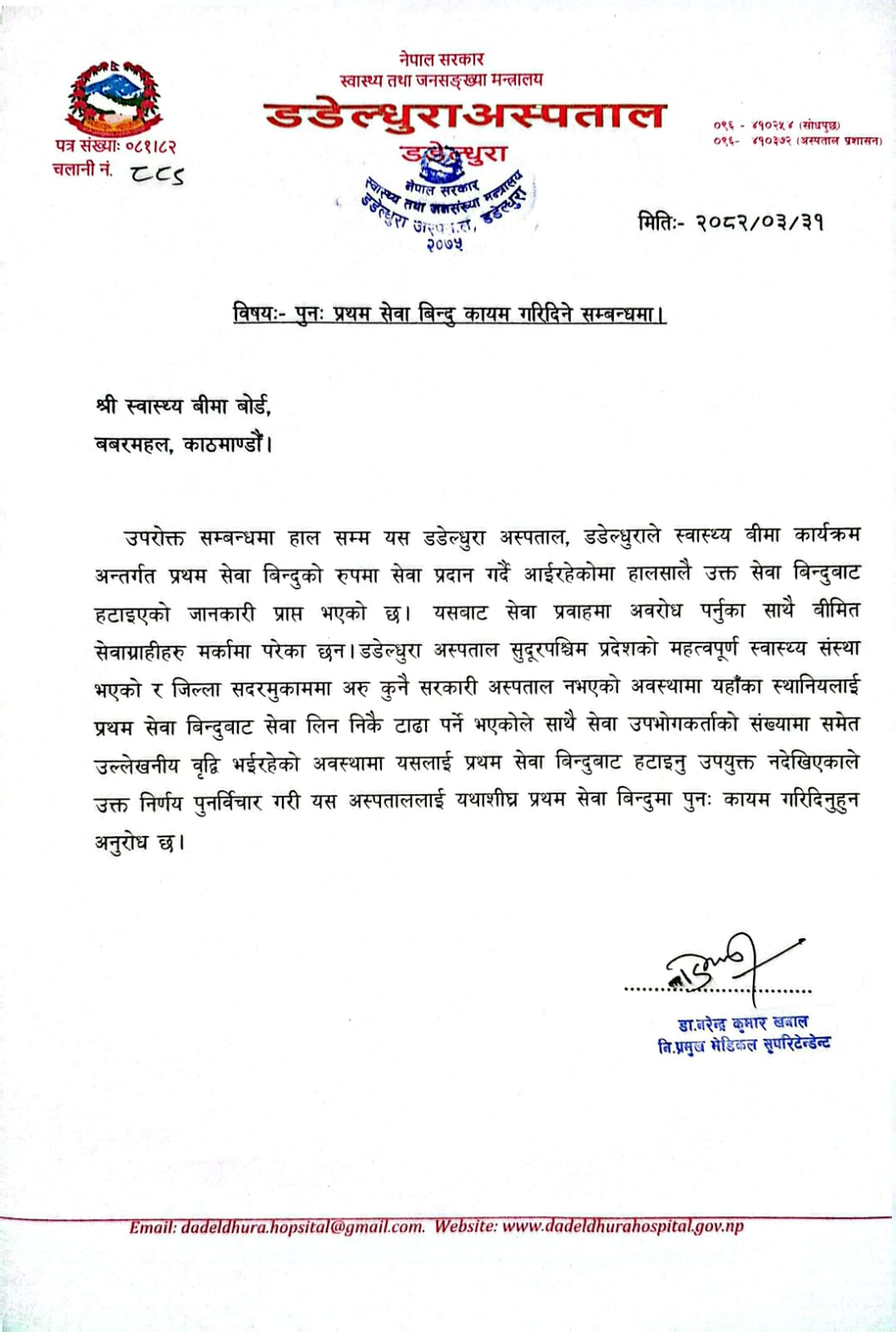 अस्पताल प्रशासनले डडेल्धुरा अस्पताललाई पुनः प्रथम सेवा विन्दु कायम गर्न आग्रह आग्रह गरेको छ। स्वास्थ्य बीमा बोर्ड बबरमहल, काठमाडौंलाई पत्र लेख्दै निमित्त प्रमुख मेडिकल सुपरिटेन्डेन्ट डा. नरेन्द्रकुमार खनालले निर्णय पुनर्विचार गर्न आग्रह गरेका हुन्।