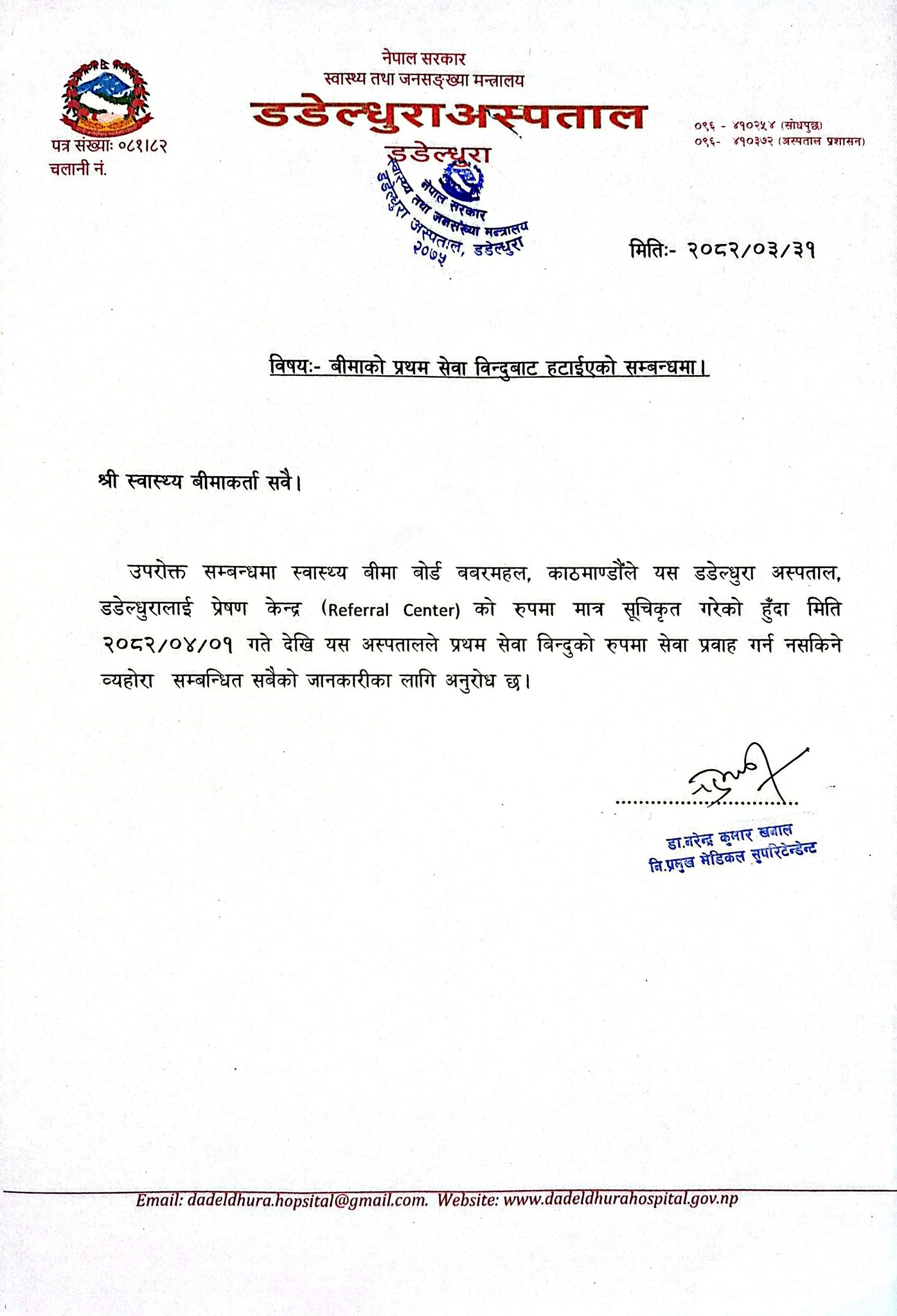 डडेल्धुरा अस्पतालका निमित्त मेडिकल सुपरिटेन्डेन्ट डा. नरेन्द्रकुमार खनालले सार्वजनिक गरेको सूचनामा साउन १ गतेदेखि बीमाको प्रथम सेवा विन्दुको रूपमा सेवा बन्द गरिने उल्लेख छ।