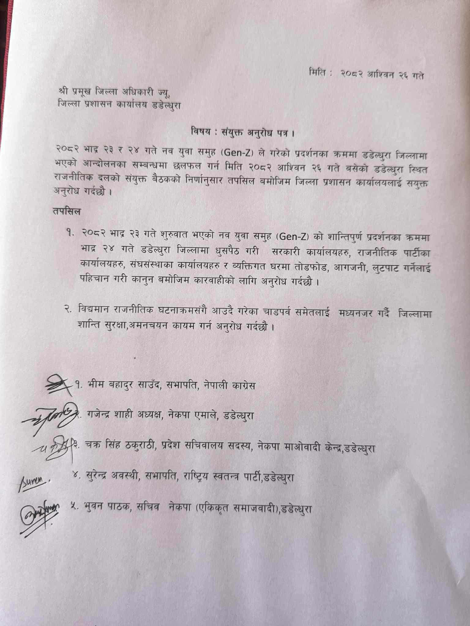 भदौ २३ र २४ गते जेनजीले गरेको प्रदर्शनका क्रममा डडेल्धुरामा भएको आन्दोलनका सम्बन्धमा छलफल गर्न आइतवार बसेको डडेल्धुरास्थित राजनीतिक दलको संयुक्त बैठकको निर्णानुसार दोषीलाई कारबाही माग गर्न प्रमुख जिल्ला अधिकारीसँग माग गरिएको हो।