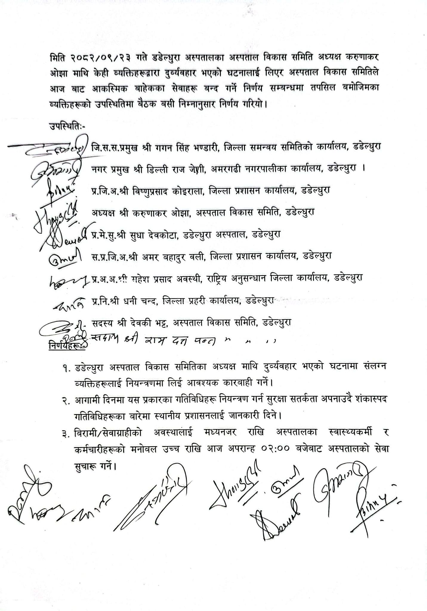 साथै, आगामी दिनमा यस्ता अराजक गतिविधि दोहोरिन नदिन अस्पताल परिसर तथा आसपास सुरक्षा सतर्कता कडा बनाउने र कुनै पनि शंकास्पद गतिविधि देखिएमा तुरुन्तै स्थानीय प्रशासनलाई जानकारी गराउने निर्णय गरिएको छ।