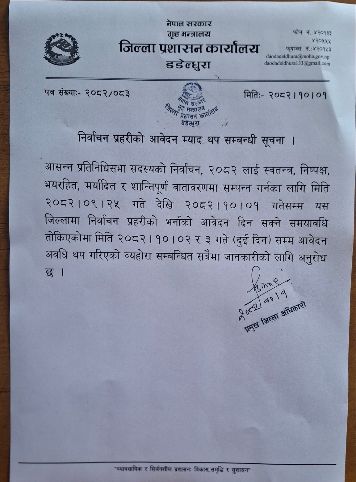 यसअघि पुस २५ गतेदेखि माघ १ गतेसम्म आवेदन दिने समय तोकिएको थियो। तर विभिन्न कारणले आवेदन दिन छुटेका इच्छुक उम्मेदवारहरूको सुविधाका लागि अब माघ २ र ३ गते गरी थप दुई दिन आवेदन अवधि बढाइएको डडेल्धुराका प्रमुख जिल्ला अधिकारी विष्णुप्रसाद कोइरालाले जानकारी दिए। उनले निर्वाचन सुरक्षालाई प्रभावकारी बनाउने लक्ष्यका साथ योग्य तथा इच्छुक नागरिकलाई तोकिएको म्यादभित्र आवेदन दिन आग्रह गरे।