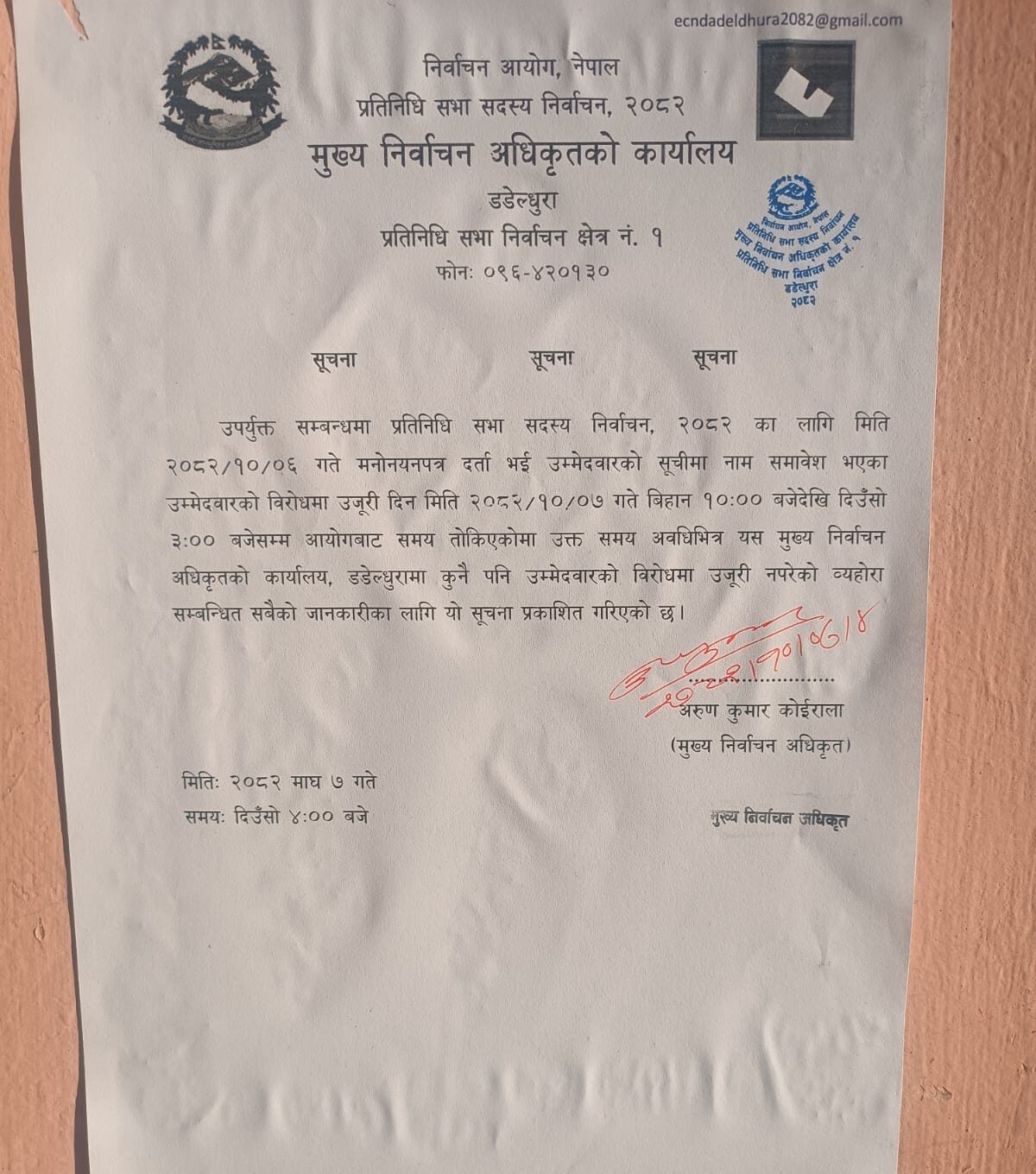 मुख्य निर्वाचन अधिकृतको कार्यालयका अनुसार मंगलवार मनोनयनपत्र दर्ता भई उम्मेदवारको सूचीमा नाम समावेश भएका उम्मेदवारको विरोधमा उजुरी दिन बुधवार बिहान १० बजेदेखि दिउँसो ३ बजेसम्म समय तोकिएको थियो।