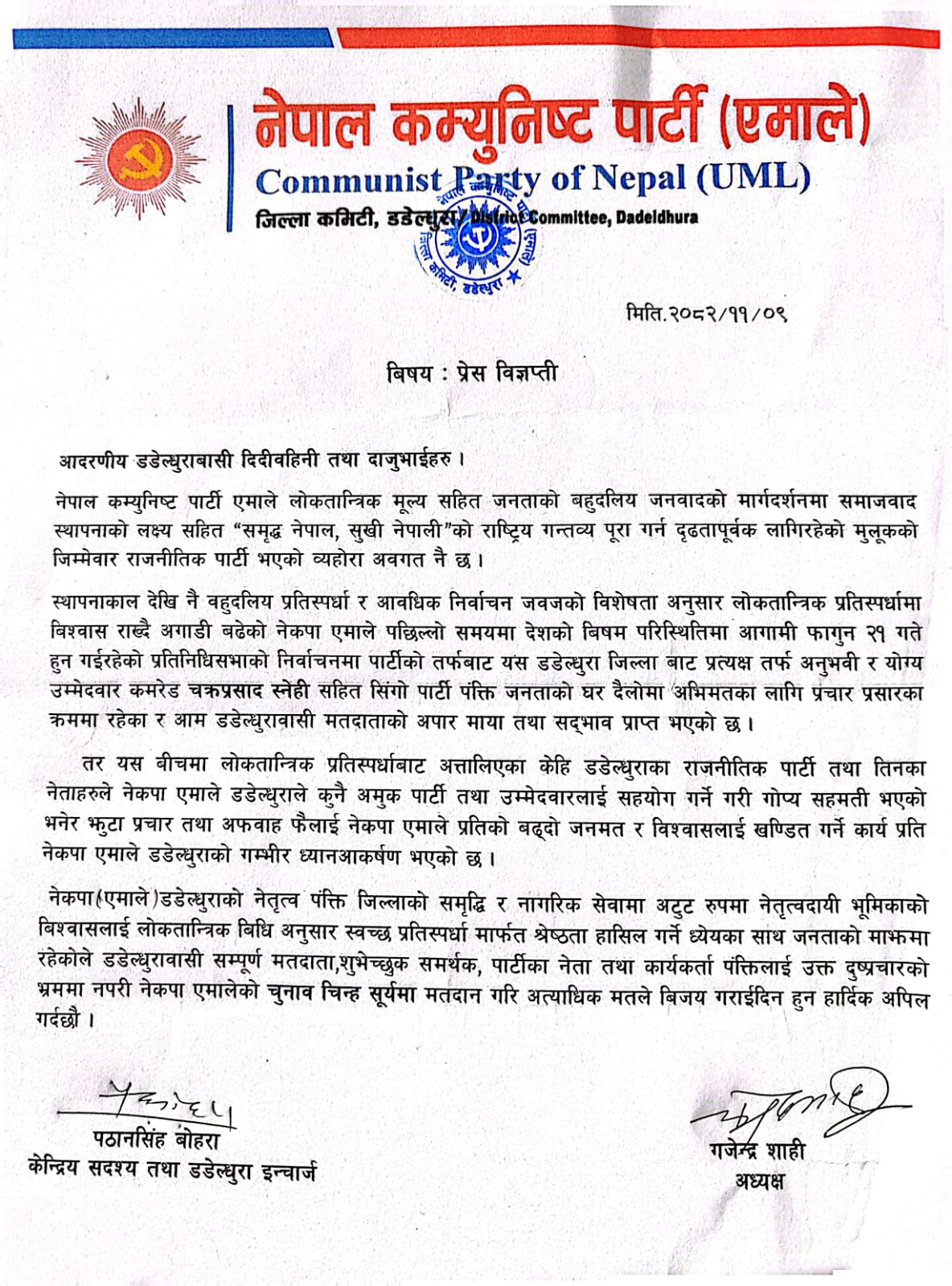शनिवार जिल्ला कमिटीद्वारा जारी प्रेस विज्ञप्तिमा आगामी फागुन २१ गते हुने प्रतिनिधिसभा निर्वाचनमा एमालेका तर्फबाट प्रत्यक्ष उम्मेदवार चक्रप्रसाद स्नेहीसहित पार्टी पंक्ति घरदैलो अभियानमा सक्रिय रहेको र मतदाताबाट सकारात्मक समर्थन प्राप्त भइरहेको उल्लेख गरिएको छ।