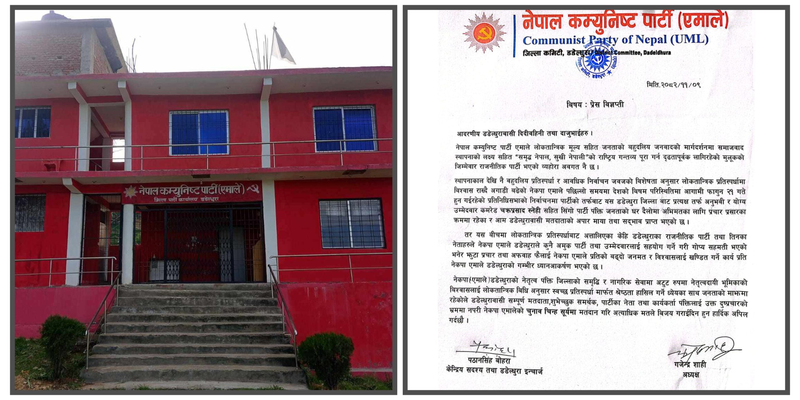 एमालेका केन्द्रीय सदस्य तथा डडेल्धुरा इन्चार्ज पठानसिंह बोहरा र जिल्ला अध्यक्ष गजेन्द्र शाहीद्वारा हस्ताक्षरित विज्ञप्तिमार्फत् लोकतान्त्रिक प्रतिस्पर्धाबाट अत्तालिएका केही राजनीतिक दल र नेताहरूले एमालेको बढ्दो जनमतलाई कमजोर बनाउन नियोजित रूपमा भ्रम फैलाएको आरोप लगाइएको छ।