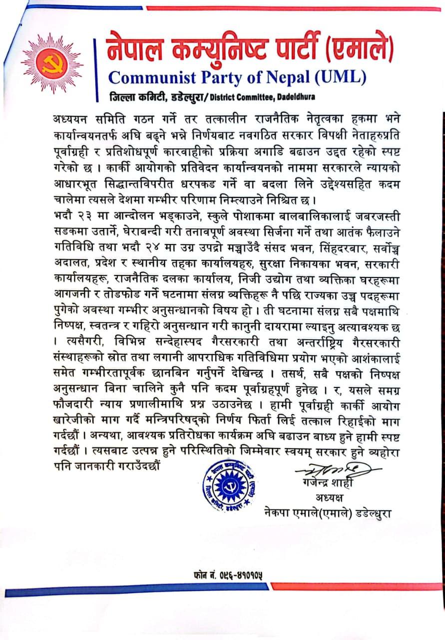 एमाले डडेल्धुराले आयोग खारेजी, मन्त्रिपरिषद्को निर्णय फिर्ता तथा अध्यक्ष ओलीको तत्काल रिहाइ नगरे कडा प्रतिरोधका कार्यक्रम अघि बढाउने चेतावनी समेत दिएको छ। यस्तो कदमले देशमा गम्भीर राजनीतिक असर पर्ने भन्दै त्यसको जिम्मेवारी सरकार स्वयंले लिनुपर्ने एमालेको विरोधपत्रमा उल्लेख छ।