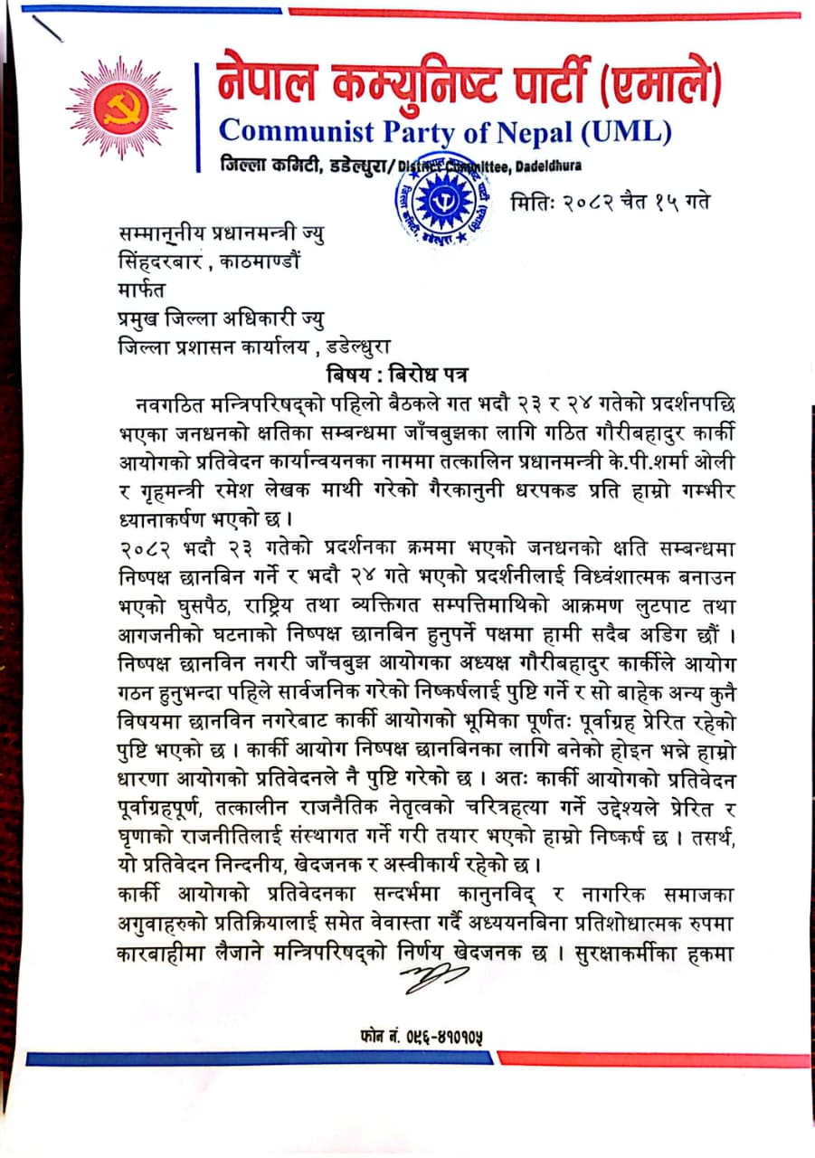 एमालेले सरकारद्वारा गठित गौरीबहादुर कार्की आयोगको प्रतिवेदनलाई ‘पूर्वाग्रहपूर्ण’ भन्दै अस्वीकार गरेको छ। उक्त प्रतिवेदन कार्यान्वयनका नाममा पूर्वप्रधानमन्त्री ओली र पूर्वगृहमन्त्री रमेश लेखकविरुद्ध गरिएको कारबाही न्यायको आधारभूत सिद्धान्तविपरीत रहेको एमालेको आरोप छ।