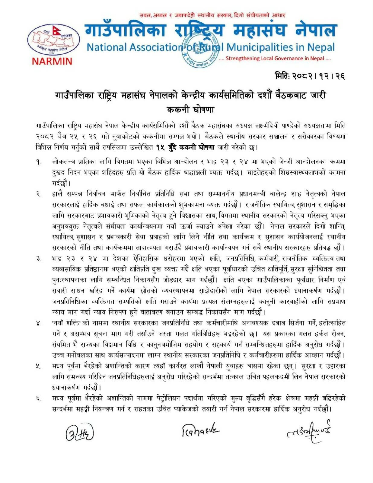 घोषणामा ‘नयाँ शक्ति’को नाममा जनप्रतिनिधि तथा कर्मचारीमाथि दबाब सिर्जना गर्ने गतिविधि रोक्न आग्रह गरिएको छ भने कानुनी प्रक्रियाअनुसार सहकार्य गर्न सम्बन्धित पक्षलाई आह्वान गरिएको छ। मध्यपूर्वमा बढ्दो अस्थिरताले त्यहाँ कार्यरत नेपाली श्रमिक प्रभावित भएको भन्दै उनीहरूको सुरक्षा र उद्धारका लागि तत्काल पहल गर्न सरकारसँग माग गरिएको छ। साथै, पेट्रोलियम पदार्थको मूल्यवृद्धिसँगै बढेको महँगी नियन्त्रण गर्न राहत प्याकेज ल्याउन पनि जोड दिइएको छ।