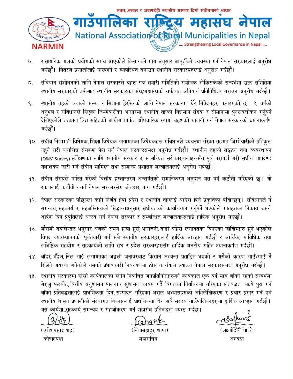 संघीय निजामती र शिक्षा विधेयकलाई संविधानअनुकूल छिटो संसदमा पेश गर्नुपर्ने (O&M Survey) सर्वेक्षणमा स्थानीय तहसँग परामर्श गर्नुपर्ने र वित्तीय समानीकरण अनुदान कटौती नगर्नुपर्ने माग पनि घोषणामा समेटिएको छ।