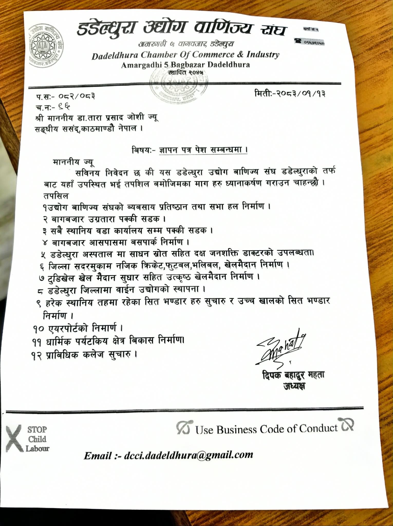 संघका अध्यक्ष दीपकबहादुर महता नेतृत्वको टोलीले आइतवार सांसद जोशीलाई मागपत्र बुझाउँदै जिल्लाको उद्योग, व्यापार, स्वास्थ्य, शिक्षा, पर्यटन, कृषि तथा खेलकुद क्षेत्रको समग्र विकासका लागि आवश्यक पहल गर्न आग्रह गरेको हो।